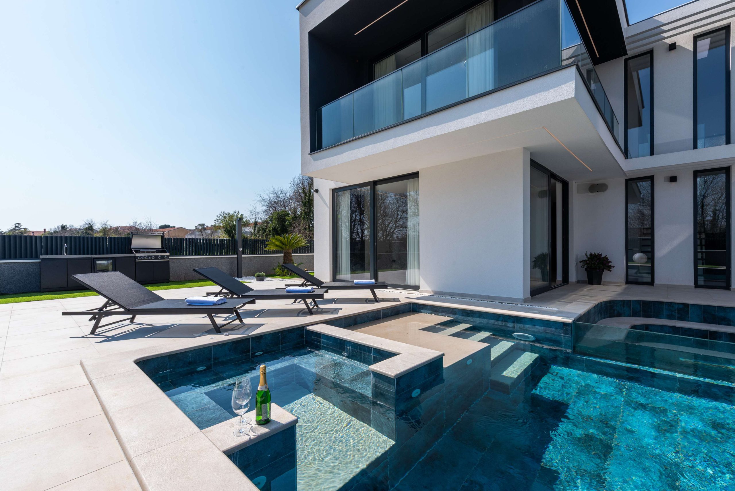 Ova luksuzna vila za najam u Istri nudi prostrani bazen s integriranim jacuzzijem, suvremeni dizajn i vrhunsku opremu za boravak do 8 osoba. Za sve koji traže luksuzne vile s bazenom, Villa Asper donosi besprijekoran spoj elegancije, udobnosti i mediteranskog mira.